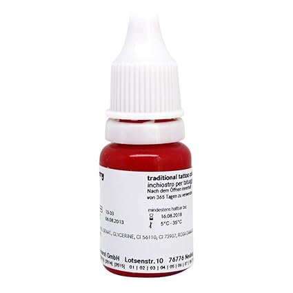 10ml Sailor Jerry Feuerrot - stark pigmentierte Tattoofarbe aus Deutschland mit Zertfikat Bewährte Tattoofarbe der höchsten Qualitäts-Stufe. Stark pigmentiert und gut deckend. Je nach Einarbeitung entsteht Weiß oder Schatten (mit Sailor Verdünner) Verwendbar zum Füllen und Schattieren mit Sailor Jerry Verdünner. Kräftige Schatten können ohne Verdünner gemacht werden. Hergestellt nach deutscher Tätowiermittelverordnung, erfüllt Reinheitsanforderung der EU-Resolution Zertifikat liegt für jede Farbe vor, gerne geben wir es dazu. Registriert beim Bundesamt für Verbraucherschtz und Lebensmittelsicherheit.