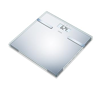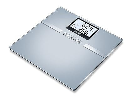 Personenwaage zur Ermittlung von Körpergewicht, Körperfett, Körperwasser, Muskelanteil, Knochenmasse und Kalorienbedarf (BMR/AMR) mit einer Einteilung von 0,1% (Körperfett, -wasser und Muskelanteil) bzw. 100 g (Körpergewicht) Körperfettwaage mit praktischer BMI-Berechnung (Body-Mass-Index) zur einfachen Einordnung des Körpergewichts in Relation zur Körpergröße und zusätzlicher Körperfettinterpretation Das extra große LCD-Display der Körperwaage verfügt über eine Multianzeige für eine übersichtliche Anzeige der wichtigsten Werte auf einen Blick. Die Gewichtsanzeige ist mit einer Ziffernhöhe von 25 mm besonders gut lesbar Modernes Design mit Trittfläche aus Sicherheitsglas und Elektroden aus gebürstetem Edelstahl. Die Körperanalysewaage ist geeignet für bis zu 180 kg Tragkraft. Schnelles Einschalten mit Tap-On Technik. Energiesparend dank Abschaltautomatik Körperanalysewaage mit zehn individuell belegbaren Benutzerspeicherplätzen und fünf wählbare Aktivitätsgrade zur genauen Berechnung der Werte