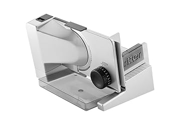 ROBUSTES DESIGN & STARKE LEISTUNG: Dank des 150 Watt kräftigen Motors wird Brot, Schinken, Obst, Gemüse und Käse im Handumdrehen in Scheiben geschnitten. Der Allesschneider überzeugt zudem durch seine robuste Verarbeitung und sein schönes Design. SICHERE & EINFACHE BEDIENUNG: Eine stufenlose, präzise Einstellung der Schnittbreite in Verbindung mit dem leichtgängig ausklappbaren Schneidgutschlitten gewährleisten maximalen Bedienkomfort. GERÄUSCHARM & LANGLEBIG: Dank des verbauten Zahnriemen Antriebs wird eine geräuscharme Benutzung und eine lange Lebensdauer gewährleistet.