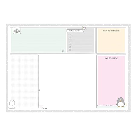ALLES IM BLICK: Mit dieser tollen Schreibunterlage in DIN A2 haben Sie das wichtigste des Tages immer im Blick. Die Unterlage ist besonders übersichtlich in verschiedene Bereiche unterteilt. Sie kann flexibel im Büro oder Zuhause verwendet werden. ALPAKAS & CO: Das Design vom Grätz Verlag ist besonders schön und modern. Besonders beliebt ist die Schreibtischunterlage bei Mädchen, Kindern aber auch für Erwachsene geeignet. LISTEN UND MOTIVATION: Durch die praktische Gestaltung haben Sie Notizen, To-Do's und Termine immer im Blick. Besonders toll ist aber 'Kritzeleien', hier kann man seiner Kreativität freien Lauf lassen. Die Bereiche sind zum Teil in Mintgrün und Rosa abgesetzt. QUALITÄT: Gedruckt auf FSC-zertifiziertem Papier, Qualität aus dem Grätz Verlag. Qualität aus Deutschland vom Traditionsverlag Grätz. › Weitere Produktdetails
