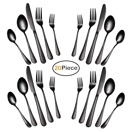 Black 24 Stück Besteckset: 6 Stück Dinnermesser, 6 Stück Dinner Forks, 6 Stück Dinner Spoons, 6 Stück Teelöffel Craft: Aus Edelstahl 18/10 mit spiegelpoliertem Finish, glatte Kante ohne raue Stellen, richtige Dicke und Gewicht, um bequem zu halten, einfaches Aussehen ohne überflüssige lästige Dekoration, klassisches Design für jedes Küchengeschirr Anwendung: Perfekt für Hochzeiten, Valentinstag, Catered Events, Party, Familientreffen, gehobene Gastronomie, Theme Restaurant oder Abendessen zu Hause. Perfektes Geschenk für Hochzeit Housewarming Geburtstag Mother's Day Restaurant oder Abendessen zu Hause und vieles mehr Spülmaschinenfest (Hinweis: Verwenden Sie ein neutrales Reinigungsmittel, um es zu spülen, bitte verwenden Sie niemals stark alkalische oder stark oxidierende Chemikalien waschen Sie sie, wie Backpulver, Bleichpulver, Natriumhypochlorit, trocken nach der Reinigung) Allen auf dem Markt überlegen; modern, bequem, mischt sich leicht mit vorhandenem Besteck, oder wenn Sie ein extra Besteckset benötigen, auch ein tolles Geschenk