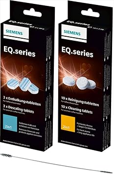 Geeignet für die EQ.series Die perfekte Pflege für ihren Kaffeevollautomaten. Siemens EQ.series Reinigungstabeletten TZ80001N 2in1: Für bestes Aroma + langes Geräteleben Reinigungstabletten sind einzelnd verpackt 10 x 2,4g Entkalkungstabletten TZ80002N entfernen Kalk und schützt vor Korrosion, geeignet für alle Kaffeevollautomaten der EQ.8, EQ.7, EQ.5, surpresso Reihe Entkalkungstabletten, Inhalt einer Packung 3 x 40g Tabs