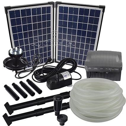 Leistungsstarkes zweiteiliges im Aluminiumrahmen eingefasstes 20 Watt Solarmodul Max. Fördermenge (Hmax.):1350l/h, Max. Förderhöhe:3,05m bei Verwendung eines Schlauches bürstenloser, langlebiger Pumpenmotor inkl. leicht zu reinigender Filtereinsatz, komplettes, steckerfertiges, leicht montierbares Komplett Set, inkl. Erdspieß inklusive 9 Meter Bachlaufschlauch, inkl. 4 Steigrohre mit 2 Düsenaufsätzen auch als Springbrunnenpumpe verwendbar inklusive Akku und weißen 6-fach LED Ring mit 80 cm Kabel inklusive separate LED-Ringaufnahme(siehe Bilder), der Anschluß erfolgt an der Pumpe