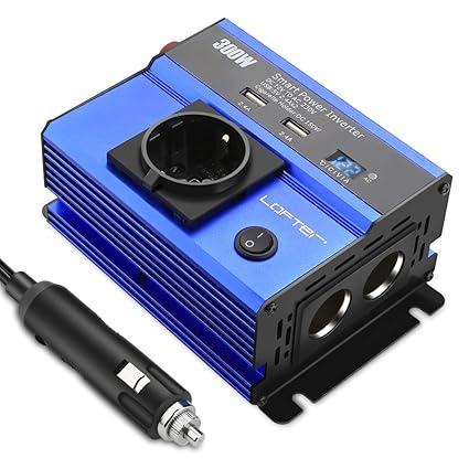 ?Zwei Arten der Stromversorgung?Die Zigarren-Kopf-Buchse und Krokodilklemme können zweifach mit Strom versorgt werden, um die Lastkraft zu erhöhen. Die Wechselstromsteckdose wird installiert und von der 12V DC-Gleichstromversorgung mit einer Autobatterie auf AC 230 V Wechselstromleistung umgestellt. Der Spannungswandler verfügt über zwei 2 USB-Anschluss und zwei Zigarettenanzünder, die mit einer Gesamtleistung von 4,8A alle Ihre Ladeanforderungen erfüllen können. Achtung: Für nur DC 12V-Fahrzeug ?6 Sicherheits-Schutz?Sicheres Ladedesign bietet Überhitzungsschutz, Überlastschutz, Kurzschlussschutz, Unterspannung, Überspannungsschutz, Überladungsschutz. Der Inverter hat eine intelligente LED-Anzeige, es zeigt Batteriekapazität, Umgebungstemperatur, USB-Spannung und Strom. Die automatische Abschaltung bei zu niedriger Batteriespannung verhindert einen übermäßigen Batterieverbrauch und stellt sicher, dass genügend Energie zum Starten des Fahrzeugs vorhanden ist. ?Leise Lüftergeräusch? Der Intelligente Kühllüfter des Umwandler bleibt während des Betriebs leise und tragen so zur Verringerung von Wärme, Sie müssen nicht mehr unter Lärm leiden. Oberflächen aus Aluminiumlegierungsmetall halten harten Umgebungsbedingungen stand und können die Kühlung effektiver unterstützen, wodurch die Lebensdauer des Produkts gewährleistet wird. ?Umfangreiche Anwendung?Der Wechselrichter kann an die Autobatterie und Zigarettenanzünder angeschlossen werden. Die Steckdose unterstützt bis zu 300 W und ist ideal für Laptops, Lampen, Camcorder, Digitalkameras, iPads und andere elektronische Geräte. Zwei Zigarettenanzünderanschlüsse können bis zu 300W ausgeben. Sie können mit diese Zigarettenanzünderanschlüsse elektronische Autostaubreiniger, Autokühlschränke und andere elektronische Produkte aufladen. ?Einfache Bedienung?Leicht und tragbar, kompaktes Design. Stecken Sie den Wechselrichter einfach in die Steckdose des Fahrzeugs oder verbinden Sie ihn mit der Batterie und setzen Sie ihn ein, um ihn zu benutzen.