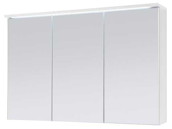 Dezentes Design mit viel Platz: Superflacher 3-türiger Spiegelschrank fürs Bad (Breite 100 cm), Integrierte LED-Frontbeleuchtung mit 1 rechteckigen Lichtfenster, Weiß Optimal zum Schminken: Helle Ausleuchtung mit tageslichtweißer Lichtfarbe durch LED-Leuchten, Kippschalter praktisch außen auf der Unterseite des Schrankes, Vollflächig verspiegelt Geräumig und flexibel: Stauraum für alle Badutensilien durch 6 verstellbare Ablageböden aus Sicherheitsglas (48.3 x 7.6 cm), Integrierte Innensteckdose für Föhn oder Rasierer Leichte Montage und stabiles Material: Fertig montierte Lieferung, Sanftes und leises Schließen der Tür durch Softclose Scharniere, Feuchtigkeitsresistent durch Spanplatte mit Melaminbeschichtung Lieferumfang: 1 Eurosan Spiegelschrank Paris mit integrierter LED-Frontbeleuchtung, Inklusive Leuchtmittel und Montageanleitung, Maße: 100 x 62 x 13 cm (B x H x T), Gewicht: 23.5 kg, Farbe: Weiß