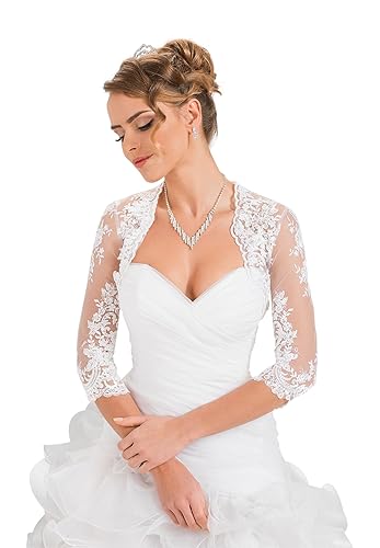 SK Studio Damen Braut Jacke Spitze Bestickt Bolero Cape Für Brautkleid Weiß Top Spitzen Tüll Jacke