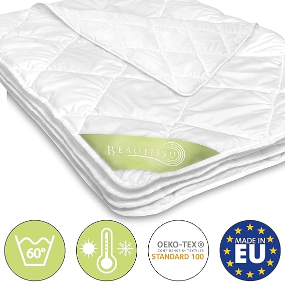 MIKROFASER BETTDECKE 145x200 Bettdecke in der Größe 135 x 200 cm. Wunderschöne und weiche Microfaserdecke als Oberbett bzw Steppbett mit 800 Gramm Füllung. BESTE QUALITÄT Die Mikrofaser Bettdecken sind in der EU gefertigt und haben eine schöne Karosteppung mit Einfassband. Ein Verrutschen der Füllung ist nicht mehr möglich. Die Zudecken schmiegen sich toll an und speichern die Wärme optimal. IDEAL ALS ÜBERGANGSBETTDECKE GEEIGNET Die atmungsaktive Übergangsdecke von Beautissu wirkt temperatur- und feuchtigkeitsausgleichend und ist ein schönes Bettzeug für Ihr Zuhause. FÜR ALLERGIKER GEEIGNET Die Zudecke ist bei 60 Grad waschbar und somit bestens für Allergiker geeignet. Außerdem können Sie diese ganz bequem im Trockner trocknen. GEPRÜFTE QUALITÄT MIT OEKO-TEX SIEGEL Unsere Mono Bettdecke ist vom Institut Hohenstein auf Schadstoffe geprüft und trägt das OEKO-TEX Zertifikat Textiles Vertrauen, Standard 100, Nr. 15.HBG.64485.