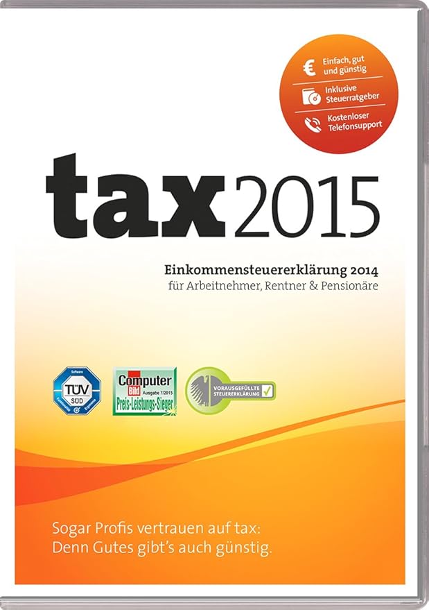 Software zur Steuererklärung 2015 am Mac, Feststellungserklärung 2015 für Erbengemeinschaften und BGB-Gesellschaften, Musterschreiben für Finanzamt-Korrespondenz Umfangreicher gedruckter Steuerratgeber (über 400 Seiten), Systemvoraussetzungen: OS X ab Version 10.7 Einkommenssteuer-Erklärung für alle Einkunftsarten: sämtliche Formulare und Erklärungen: N, R, Kind, KAP, SO, G, S, L, 34a, EÜR, FW, V, AV, AUS, N-AUS, N-Gre, K, U, Unterhalt, Weinbau, SZE, Zinsschranke, AVEÜR, Vorsorgeaufwand, 145 neue Videos mit Steuer-Tipps, Import-Assistent für Daten aus dem Vorjahr: auch aus der Windows-Version, Kostenfreie Updates für das Steuerjahr 2015 Steuererklärung als Ausdruck und via Internet (ELSTER), Sofortige Anzeige nach jeder Eingabe: Erstattung und Nachzahlung, Schnell-Rechner für jede Gelegenheit: Gehalt, Abfindung, Erbschaft, Kfz-Steuer, Riester u.v.m., Kostenloser Telefonsupport Extra-Funktionen für Selbstständige: Einnahmen-Überschuss-Rechnung (EÜR), Umsatzsteuer-Voranmeldung; Lohnsteuer-Anmeldung, Fahrtenbuch, Automatischer Vergleich von amtlichem Steuerbescheid mit Programmberechnung, Praxisnahes Bedienbuch (als PDF), Kostenlose Tablet-App für iPad und Android; Software inklusive Ratgeber-Buch