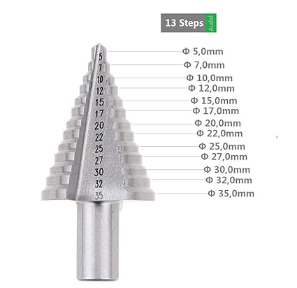???? Ultra langlebig, hochwertiger HSS-Stahl mit Titan beschichtet, Titan beschichtet, um Reibung und Wärme zu reduzieren. ???? Mit nur einer geringen Menge an Druck und automatisch bohren Löcher, wie Sie bohren. ???? Bietet schnelle, glatte und saubere Schnitte, jeder Schritt ist eindeutig mit dem Durchmesser und Tiefe beschriftet. ???? Loch Größen: 13 schritte (5, 7, 10, 12, 15, 17, 20, 22, 25, 27, 30, 32, 35 mm) ???? Er kann für viele verschiedene Materialien wie Stahl, Messing, Holz, Kunststoff, Kupfer, Glasfaser und PVC benutzt werden. › Weitere Produktdetails