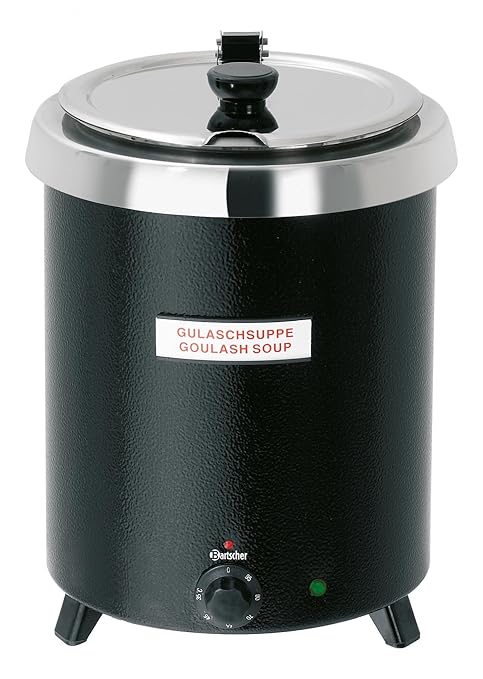 Bartscher Suppentopf mit einer Füllmenge von 12,5 Liter Aus Stahlblech, CE und ROHS geprüft! Temperaturbereich regelbar von 35 -95 °C Anschlusswert: 600 W, 230 V 1 Ph, 50 Hz Durchmesser: 400 mm, Höhe: 400 mm