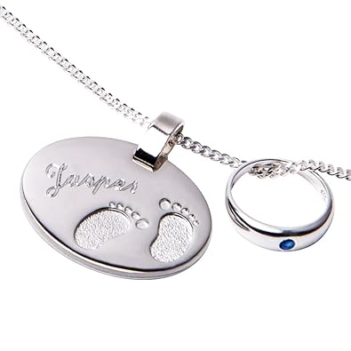 Sehr schönes Kinder-Schmuckset. Das passende Geschenk zur Geburt und Taufe. Baby / Kinderkette mit Kettenanhänger kleine ausgestanzte Füßchen inkl. Ihrer Wunschgravur auf der Vorderseite max. 8 Buchstaben. Kinderschmuck Anhänger: 925/- Sterling Silber Ø 21 x 17 mm, Taufring Ø ca. 12 mm Zirkoniastein weiß Ø ca. 2 mm Die hochwertigen Artikel sind mit einem Echtheitsstempel versehen. Lieferung inkl. Geschenkfaltbox.