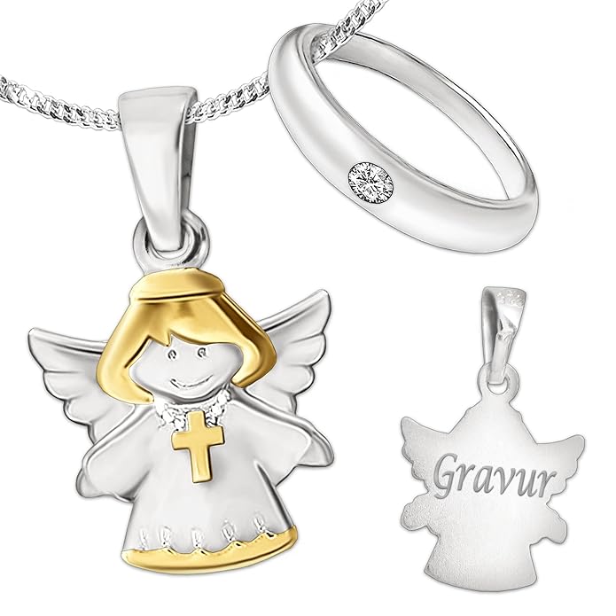 Engelsanhänger, Taufring, Gravurplatte und Taufkette alles glänzende Optik aus 925er Sterling Silber und mit Echtheitsstempel