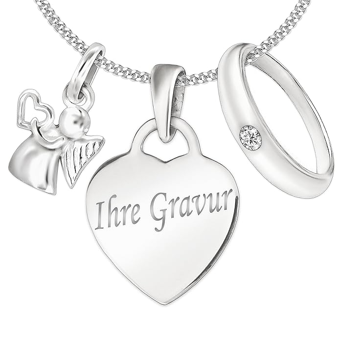 Clever Schmuck Set mit Gravur: 3 Silberne Anhänger Gravurplatte 12 mm inkl. Gravur einseitig + Mini Engel 10 mm Herz in der H
