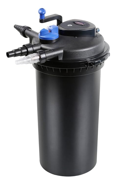 Einfaches und unkompliziertes Bio-Druckteichfilter-System für Teiche bis 10000l. UV-Filter Leistung 11 Watt, max. Pumpenleistung 10000l/h. Für Teiche mit Fischen bis 5000 Liter.
