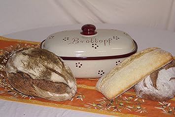 Maße Brottopf groß: ca.19,00 x 34,00 x 21,00 cm Farben: Kräuterwind, Heile Welt und Geblaut Herkunft: Brottopf in Handarbeit aus dem Westerwald Material: Steinzeug Keramik, salzglasiert im Vintage Look Besonderheiten: Handgemachter Brottopf