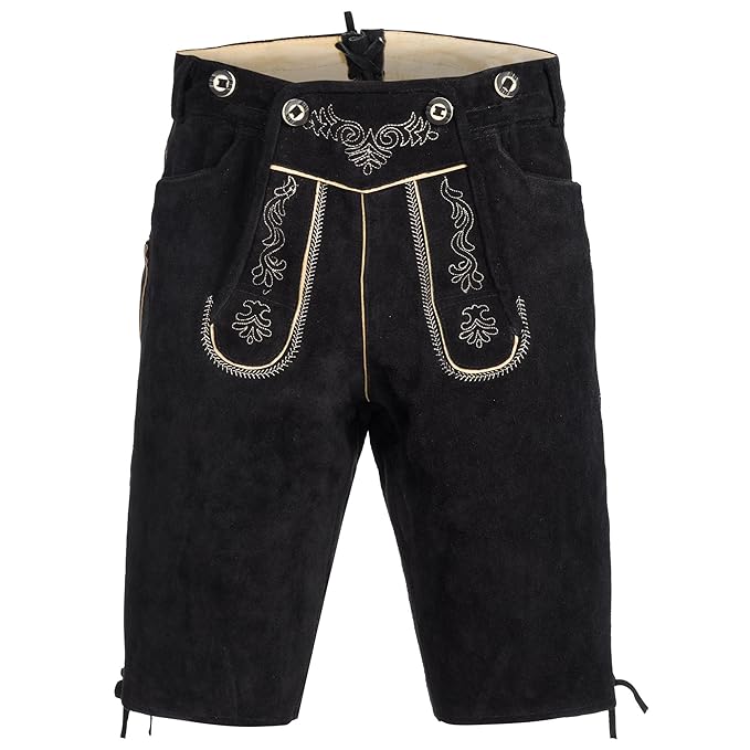 Kurze Lederhose mit Hosenträgern in den Farben schwarz oder braun. Aus echtem Wildleder gefertigte Trachtenhose. Leder Pflegehinweis: chemische Reinigung Einzigartige traditionelle Stickerei in Weiß, mit Hirsch und Bergmotive auf der Vorder- und Rückseite der Trachten Lederhose. Individuelle Größenanpassung dank Schnürung am Hosenbund und Beinen. Die Hosenträger sind individuell einstellbar. Hose fällt eher etwas kleiner aus - Größentabelle für die perfekt passende Trachtenlederhose sowie weitere Details finden Sie in der Produktbeschreibung.