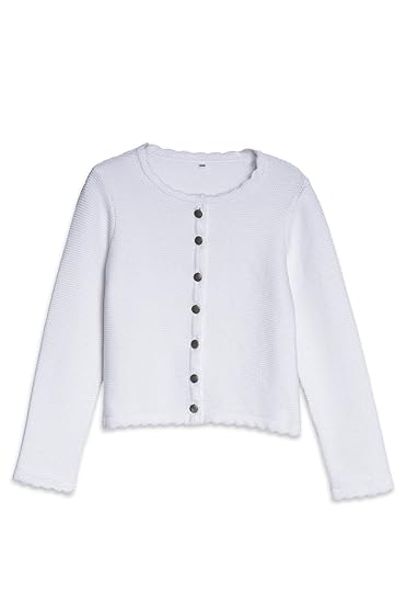 Super schöne Kinder Strickjacke in der Farbe weiß, Kommunionsjacke. Mit vier schönen Knöpfen bis Gr.104, ab Gr. 110 mit fünf schönen Knöpfen vorne. (Ein Ersatzknopf inklusive) 50% Baumwolle, 50% Polyacryl Knöpfe mit schicken Applikationen. Maschinenwäsche 30°. Top Qualität von deutschem Hersteller.