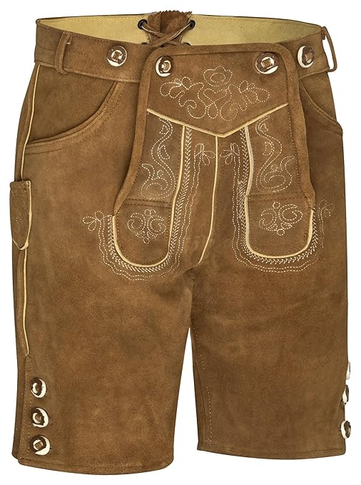 TOP PREIS-LEISTUNG - Hochwertige Trachten Lederhose für Männer in den Farbvarianten schwarz, mittelbraun, dunkelbraun (schokobraun), beige, hellbraun und grau mit Stickerei auf der Lederhose sowie auf den Hosenträgern HOSENTRÄGER IM LIEFERUMFANG - Das Komplett-Set beinhaltet neben der Trachtenlederhose zusätzlich noch verstellbare Hosenträger (auch für Personen größer 190cm), die einen optimalen Sitz der Lederhose gewährleisten. Die Herren Lederhose Kniebund kann jedoch auch ohne Träger getragen werden - z.B. mit einem Almbock Trachtengürtel MATERIAL - 100% Rindsleder TRAGEKOMFORT & PASSFORM - Verfügbar ist die urig bayerische Kniebundhose in den Größen 46, 48, 50, 52, 54, 56, 58, 60. Die Almbock Lederhose fällt normal aus und trägt sich aufgrund des echten Leders sehr gut ein QUALITÄT - Die Tracht Lederhose wurde auf der Innenseite mit geschmeidigen und atmungsaktiven Mikrofaserstoffen ausgekleidet, die einen komfortablen Sitz gewährleisten. Feine Stickereien sowie ein sorgfältig gewähltes Leder sind weitere Qualitätsmerkmale EIN HINGUCKER - Mit dieser Oktoberfest Hose machen Sie immer eine tolle Figur! Egal ob in Tracht zum Oktoberfest in München, zu anderen Volksfesten aber auch zu festlichen Anlässen wie einer Hochzeit oder einem geselligen Sonntagsausflug mit Freunden