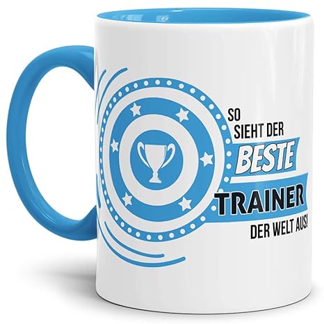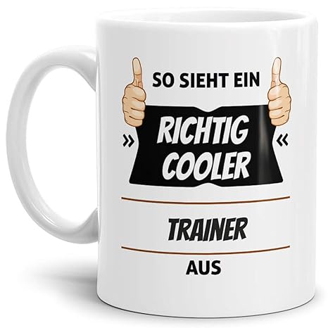 schöne Geschenk-Tasse mit cooler Botschaft 'So sieht ein richtig einrichtig cooler Trainer' der Marke MoonWorks formschöne Komfortgröße mit ca. 325 ml Fassungsvermögen und großem Henkel für einen optimalen Griff Spülmaschinengeeignet - leichte Reinigung und hohe Haltbarkeit hochwertige Qualität verspricht eine hohe Langlebigkeit und eine lange Farbbrillanz in Deutschland mit Liebe zum Detail designed und in Handarbeit bedruckt - 100% handmade