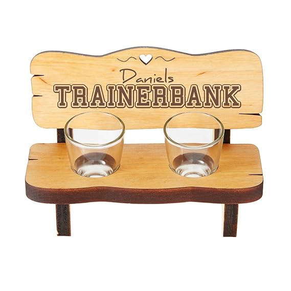 SCHNAPSBANK MIT GLÄSERN: Die kleine Schnapsbank bietet Platz für zwei Schnapsgläser. Auf die Lehne der Bank wird der Spruch „[Wunschname]‘s Trainerbank“ graviert. So hat der Beschenkte immer einen Schnaps parat.