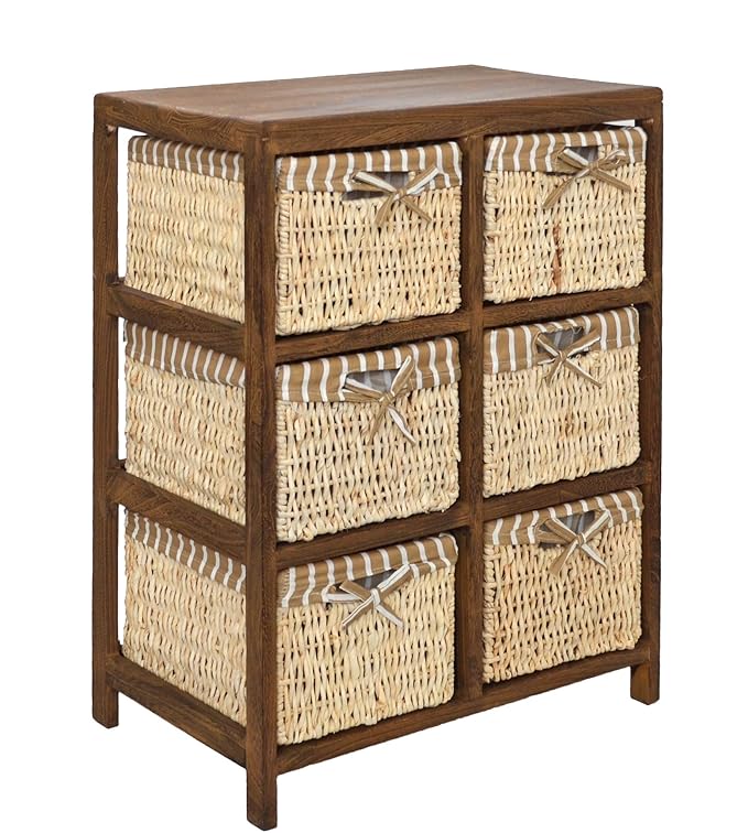 Korpus aus Paulownia Holz in waschgrauer Optik Maße: ca. 62 cm x 70 cm x 30 cm (Höhe x Breite x Tiefe) sechs geflochtene Körbe aus Weizenstroh mit Stoffbezug Innenmaßen: ca. 13 cm x 17 cm x 24 cm (H x B x T) Lieferung erfolgt komplett montiert, kein weiterer Aufbau erforderlich