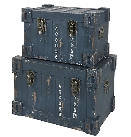 Korpus in Blau aus MDF (Mitteldichte Holzfaserplatte) in Used Optik Maße: ca. 45 cm x 35 cm x 32 cm (Höhe x Breite x Tiefe) Kanten verstärkt mit rustikalen, großen Metallschrauben drei Holz-Schubladen mit beschrifteten Fronten, innen mit Stoff verkleidet Lieferung erfolgt komplett montiert, kein weiterer Aufbau erforderlich
