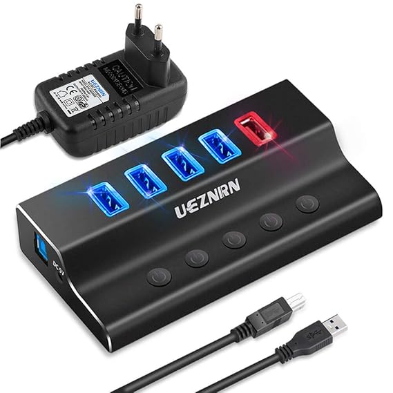 ?? APANAGE USB HUB: Neuen Design 5 Ports USB Hub Splitter mit eingebaut 120cm USB Kabel, das sich bequem mit Ihrem Schreibtisch verbinden lässt. ?? GROSSE ERWEITERUNG: Ausgestattet mit 4 Ports USB 3.0, sparen Sie Synchronisationszeit mit Datenübertragungsraten von bis zu 5 Gbits. Sie können problemlos verschiedene moderne Gerätetypen und Peripheriegeräte anschließen und verwalten. ?? AUFLADEN IHRES TELEFONS: 1 intelligenter Ladeanschluss für Ihr Mobiltelefon bietet eine optimale Ladung bei Geschwindigkeiten von bis zu 2,4 A. ?? INDIVIDUELLE SCHALTER: Für jeden Port gibt es individuelle Ein / Aus-Schalter mit LED-Anzeigen. ?? EINFACHES SETUP: Unterstützt PLAY und Hot Plug. Abwärtskompatibel mit USB 2.0 und USB 1.1. › Weitere Produktdetails
