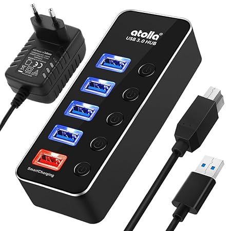 atolla USB Hub mit Netzteil, USB 3.0 Hub Aktiv mit 4 Ports SuperSpeed Datenhub mit Schalter und 1 Intelligenter Charging Port