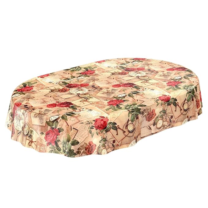 ANRO Tischdecke Wachstischdecke Wachstuch Wachstuchtischdecke Beige Rose Blumenmotiv Oval 140x200cm eingefasst