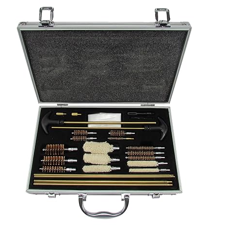 ?Alles dabei was man zur Reinigung einer Waffe braucht.? (Putzstockes *4, Bronze Bürsten *2, Waffenreinigungstücher, Tücher Hilfsmittel *1, Doppelend Bürste *1, 20ml Öler *1) ?Brauchbares Waffenpflegeset?Es ist handlich gut zusammen zu bauen und für unterschiedlich lange Läufe zu verwenden auch für Kurzwaffen. ?Optimal für Unterwegs oder Schießplatz?Alles was man braucht in handlich Aufbewahrungstasche. (Gewicht: 250g) Die Bronze Bürsten sind bestens für 5.56mm/.22 .223 Cal Läufe geeignet. ?Pflegeset ist in Praktischer Funktioneller Ausführung?Auch bei lange Lauf ist durch die Verlängerung des 4 Putzstockes das Reinigen kein Problem; Im Öler kann man gut öl einfüllen; Doppelend Bürste um das Äußere Ihrer Feuerwaffen zu reinigen.