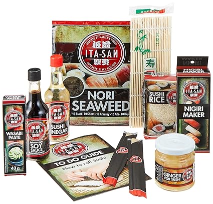 Sushi-Kit von ITA-SAN für Profis und Anfänger inkl. Anleitung Alle Grundzutaten in einer praktischen Box - fügen Sie Gemüse und Fisch nach Wunsch hinzu - Ihrer Kreativität sind keine Grenzen gesetzt Sushi für zu Hause - Ideal für einen Sushi Abend zu zweit, mit Freunden, Familie oder Bekannten Es handelt sich bei den Grundzutaten um handelsübliche Einheiten - keine Portionsbeutel. Diese reichen in der Regel für mehrere Sushi Erlebnisse 9-teiliges Sushi-Set im Vorteilspack - Bambus Rollmatte (1x), Stäbchen (4x), Sushi-Former (1x), Nori-Seealgenblätter (28g), Sushi-Reis (500g), Sushi Essig (150ml), Sojasauce (150ml), Wasabi (43g), Sushi-Ingwer (110g) › Weitere Produktdetails
