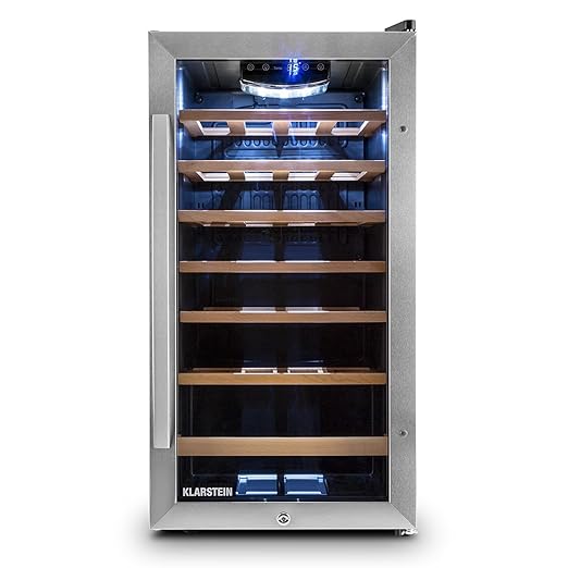 ? Umweltfreundlicher und leiser Weinkühlschrank mit 48 Liter Volumen für 18 Weinflaschen. ? Übersichtliche Bediensektion mit LED-Display und Innentemperaturanzeige ?Temperaturzone 18 Flaschen 8°-18°C (bei Standardflaschen bis zu 310 mm Höhe) ?5 herausnehmbare Holzregaleinschübe ?hochwertiger Weinkühlschrank laufruhige elektronische Kühlungkompaktes Design mit Glastür und Rahmen aus gebürstetem Edelstahl › Weitere Produktdetails