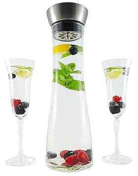 inklusive Kühlsockel & 2 Kühlakkus Füllmenge ca. 1 Liter / auch für kohlensäurehaltige Getränke geeignet Deckel mit praktischem Ausgießer und integriertem Sieb - der Deckel öffnet und schließt beim Gießen automatisch das integrierte Sieb hält Eiswürfel, Früchte etc. auch beim Ausgießen zurück Material: handgefertigtes Glas, hochwertiger Edelstahl (matt), Silikon / Abmessungen ca. ? 10 x 34 cm / Artikel ist spülmaschinengeeignet, eine Reinigungsbürste liegt ebenfalls bei