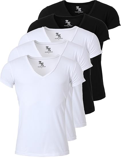 PASSFORM: Das Shirt hat eine körprbetone Passform (Slimfit Schnitt). Der fein gerippte Stoff sorgt für Flexibilität und passt sich der Körpersilhouette gut an. DESIGN & DETAILS: trendige Farben mit einem extra tief geschnittenen V-Ausschnitt sorgen für einen angesagten und zugleich zeitlosen Look. Gerader Schnitt MATERIAL: Farben: Weiß, Schwarz, Grün, Rot, Blau, Türkis 100% Baumwolle; Farben: Grautöne 80% Baumwolle, 20% Polyester; Farbe: Blau-Melange 60% Baumwolle, 40% Polyester KOMFORT: bequemes Tragegefühl durch das angenehme Material. Der leicht gerippte Stoff passt sich der Figur gut an und sorgt für einen hervorragenden Tragekomfort. QUALITÄT: das Fashion-Label Young & Rich punktet mit einer langjährigen Erfahrung im Modesegment und bietet qualitativ hochwertige Produkte mit einem hervorragenden Peis-Leistungsverhältnis.
