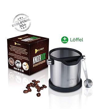 ? ROBUSTER EDELSTAHL - Eine TOP Verarbeitung nur für Ihren besten Kaffee. Die Knockbox wurde aus hochwertigstem Edelstahl hergestellt und ist somit ein echter Hingucker neben Ihrer Espressomaschine.Ein weiterer Vorteil ist die Verhinderung einer frühzeitige Rostentstehung! ???? SICHER UND RUTSCHFEST - Die gummierte Unterseite des Tresterbehälter sorgt beim Abklopfen für einen rutchfesten Stand. Somit bleibt es gegen jeden Schlag beständig und verhindert dementsprechend ein Verschütten des Behälters oder anderem Zubehör wie z.B Espressokännchen! ???? GRÖSSERES VOLUMEN - Anhand des größerem Volumen der Knock Box, können Sie jetzt viel mehr Kaffe Pads, Kaffe Puks oder andere Kaffee Reste entsorgen. Dennoch ist der Groß Behälter aufgrund seiner Form, die ideale und platzsparendste Lösung für die Küche eines Kaffe Liebhabers! ???? SPÜLMASCHINENFEST - Der Abschlagbehälter kann in jeder Spühlmaschine gerreinigt werden, ohne dass Sie sich Sorgen um Ihren Abschlagbehaelter oder dass Silikon machen müssen. Aufgrund der Silikonverarbeitung der Abklopfstange bietet der Behälter eine exzellente Geräuschedämpfung! ???? 60 TAGE GELD ZURÜCK - Um Ihnen die Kaufentscheidung zu erleichtern nehmen wir das Risiko auf uns und machen ein „Unglaubliches Versprechen“: Sollten Sie aus einem Grund nicht zufrieden mit unseren Kaffeezubehör sein, bekommen Sie ihr Geld zurück - bis zu 60 Tage nach Kauf!