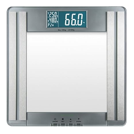 Personenwaage zur Ermittlung von Gewicht, Körperfett, Körperwasser, Muskelanteil, Knochenmasse und Kalorienbedarf (AMR)