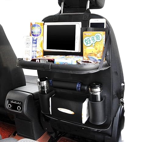 Es ist ein Autositz Veranstalter mit einem faltbaren Auto Esstisch, 3 transparente Taschen für das Halten Ihres iPad, Telefon oder geliebten Fotos; Eine Nylon-Netztasche für das Putting Magazin oder einige kleine Gegenstände, ein Becherhalter; 1 Gewebekasten; Ein elastisches Band zum Aufhängen deiner Feder oder Brille