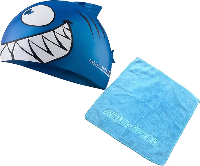 HOGAR AMO 2 Teilig Kinder Haifisch/Niedlicher Fisch Bademütze Set Schwimm Kappe Mütze Silikon Swimming Cap Kit Super-Stretch
