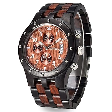 Natürliches Holzmaterial: Es ist aus rotem und schwarzem Sandelholz, keine Chemikalien und keine Malerei, die umweltfreundlich und hypoallergen ist, komfortabel. Leichtgewicht: Im Vergleich zu den Uhren aus Metall ist diese Holzuhr extrem leicht, nur 0,12 lb. Multifunktion: Die Uhrensätze mit Kalenderanzeige und einem winzigen zweiten Zifferblatt, sowie leuchtenden Händen im Dunkeln, was im Alltag sehr praktisch ist. Hohe Qualität: Das japanische VD73 Quarzwerk und die Batterie garantieren hohe Qualität und präzise Zeit. Faltschließe aus Edelstahl ist bequem und sicher. Perfektes Geschenk: Der Business- und Sport-Stil ist ideal für Männer, also wird es ein perfektes Geschenk für Ihre Familien oder Freunde sein, egal ob Geburtstag, Jahrestag, Abschlussfeier oder Weihnachten.