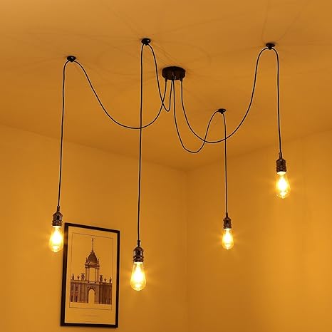 Eine dekorative Pendelleuchte mit fünf Lampenfassungen, Gewebt Netzkabel und mit einem Metalldecke stieg.