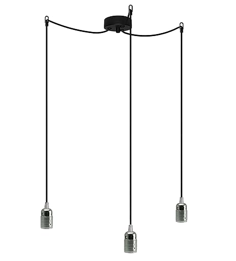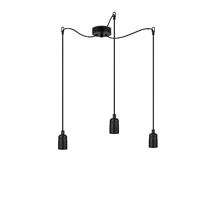 Eine dekorative Pendelleuchte mit drei Lampenfassungen, Gewebt Netzkabel und mit einem Metalldecke stieg. Drei Messing/Schwarznuss Lampenfassungen. Schwarz Metalldecke. Schwarz Gewebt Netzkabel. › Weitere Produktdetails