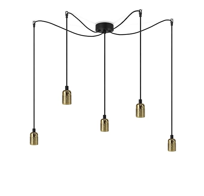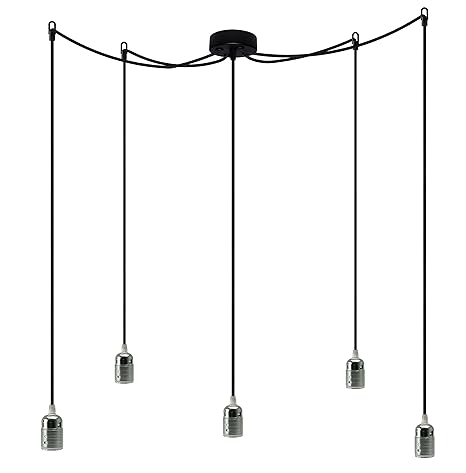 Eine dekorative Pendelleuchte mit fünf Lampenfassungen, Gewebt Netzkabel und mit einem Metalldecke stieg. Fünf Nickel/Schwarznuss Lampenfassunge. Schwarz Metalldecke. Schwarz Gewebt Netzkabel. › Weitere Produktdetails