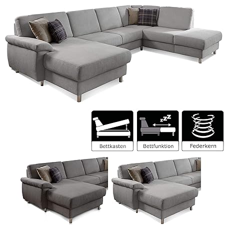 Lieferumfang: Cavadore 5167 Wohnlandschaft Irriba / Mit Federkern / Mit Bett- und Bettkasten / Longchair und Ottomane beidseitig montierbar / Füße: Kunststoff verchromt