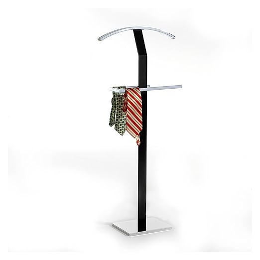 Aufbaumaß Herrendiener: 46,5 x 112 x 28,5 cm (Breite x Höhe x Tiefe) Stummer Diener mit einem modernem Materialmix aus Metall und Massivholz für Schlafzimmer oder Ankleidezimmer Mit der edlen Farbkombination schwarz mit natur passt dieser Kleiderständer zu bereits vorhanden Möbelstücken Knitterfreie Aufbewahrung von Hosen Anzüge Sakkos oder Blusen mittels Jacken- und Hosenbügel Passende Accessoires wie Uhren oder Schmuck finden ihren Platz auf der praktischen Ablage