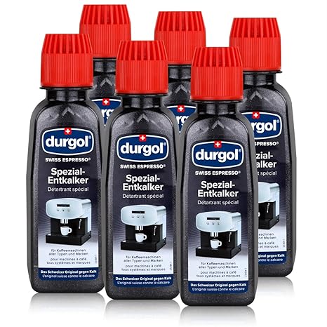 4 x 125 ml SpezialEntkalker für hochwertige EspressoMaschinen aller Marken, einschließlich Vollautomaten, Manuelle Maschinen und Kaffeemaschinen mit Kaffeepads oder Kapseln FilterKaffeemaschinen und Teekessel können auch mit Durgol entkalkt werden Spezial-Entkalker für Kaffeevollautomaten, Halbautomaten, Kolbenmaschinen und Kaffeepadmaschinen, Filter-Kaffeemaschinen und Teekessel können auch mit Durgol entkalkt werden Hochwirksam und einfach anzuwenden, gebrauchsfertig