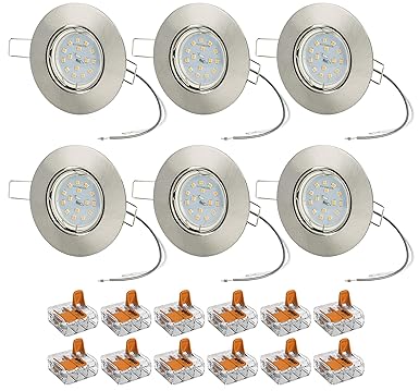 Lieferumfang: 6x Einbaustrahler Farbe: Edelstahl gebürstet - 6x Flache LED warmweiß 12X 230V Stromklemme