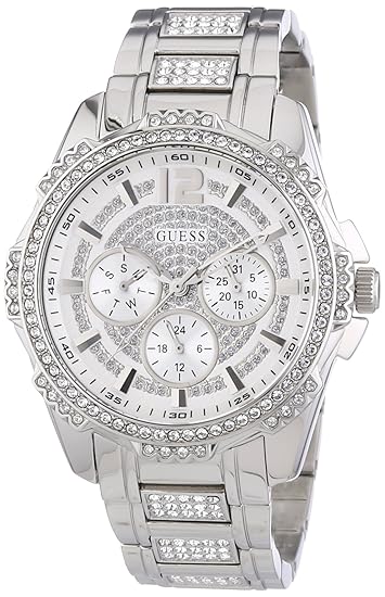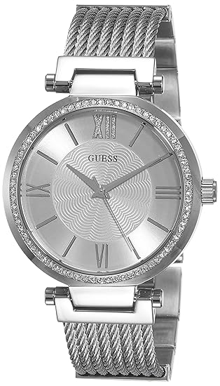 Gehäusedurchmesser: 36 mm Gehäuse: Edelstahl silber Armband: Edelstahl silber Ziffernblatt: Glitzer silbern, mit silbernem Guess Schriftzug und Zeigern Wasserdichtigkeit: 3 bar