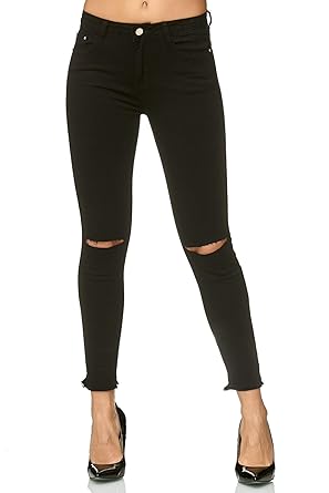 Damen Stretch RÖHREN HÜFT Jeans Hose MIT Rissen Skinny Slim FIT SCHWARZ