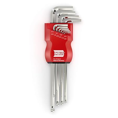 INHALT - Satz mit 13 × INBUS L-Serie imperial: 0.05' | 1/16' | 5/64' | 3/32' | 7/64' | 1/8' | 9/64' | 5/32' | 3/16' | 7/32' | 1/4' | 5/16' | 3/8' EIGENSCHAFTEN - Ausführung extra lang, passend für Zoll Innensechskant-Schrauben (inch / zöllig). Hergestellt aus hochwertigem INBUS-Stahl 59CrV4. EXTRAS - Kugelkopf ermöglicht ein Schwenken des Schlüssels um bis zu 30 Grad in alle Richtungen. Versteckte Schrauben können mühelos und schnell erreicht werden. GARANTIE - 10 Jahre auf Das Orginal - Made in Germany INBUS - Ausgezeichnet als 'der Innensechskantschlüssel' gehört INBUS offiziell zu den 200 deutschen Marken des Jahrhunderts. › Weitere Produktdetails