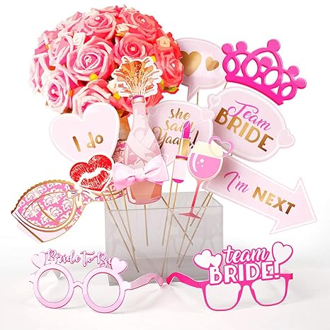Maße: die Größe der einzelnen Accessoires ist unterschiedlich Inhalt: Brille 'Bride to be', Champagnerflasche, Sektglas, Lippenstift, Kussmund, Diamantring, Schild 'Miss to Mrs', Schild 'Team Bride', Schild '#Selfie', Herzchenbrille